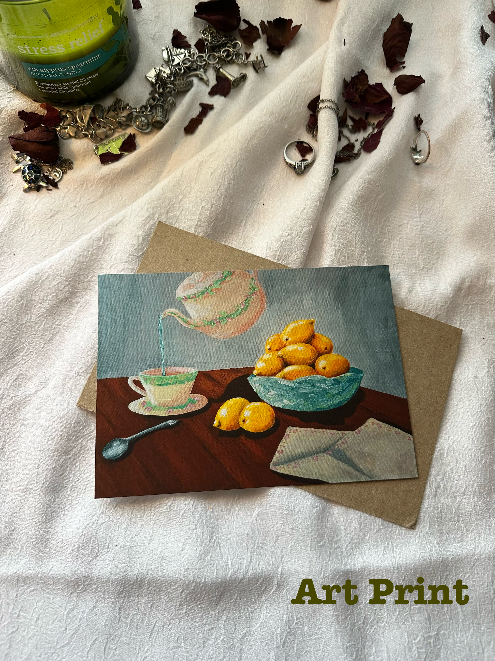 A bright still life of lemons and a tea cup, capturing the warmth and freshness of simple moments.